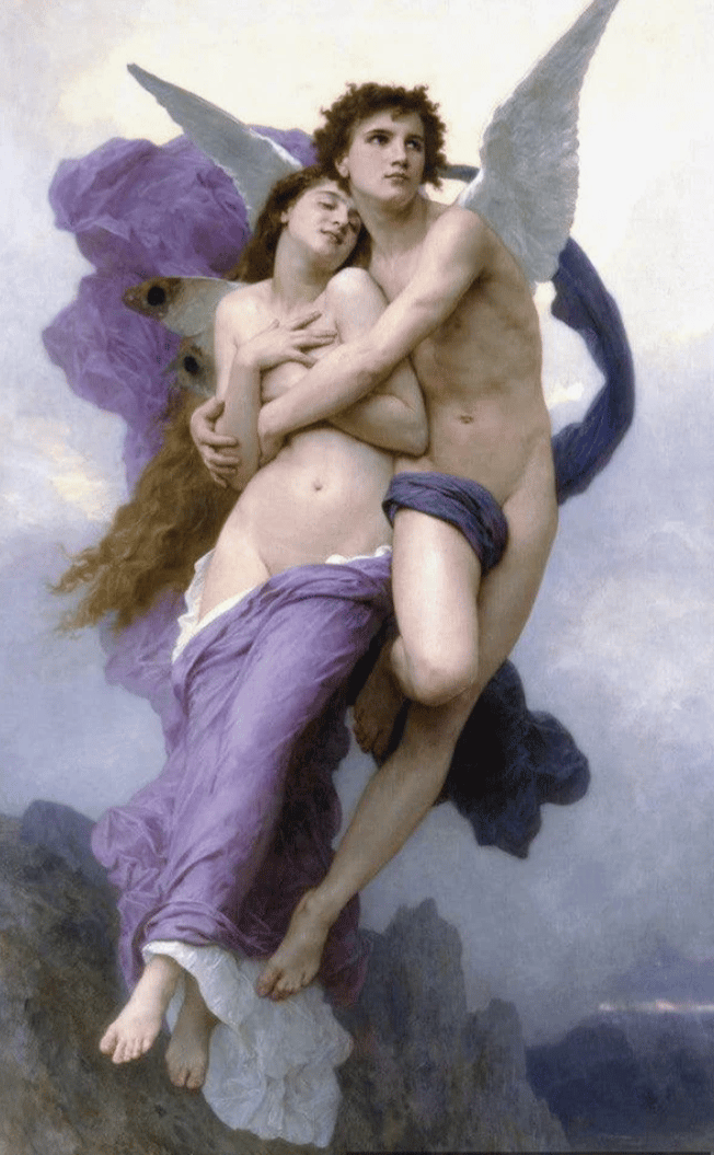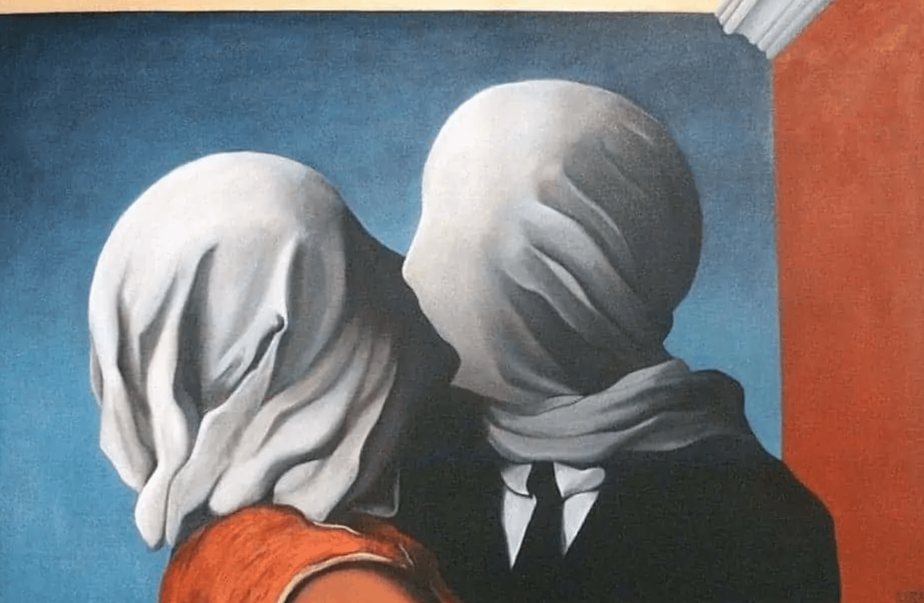 Lovers’ eye jewelry was especially popular among the members of the court of King George III and was typically given as a secret token of love between two people who could not be together publicly. The jewelry was also popular among travelers, who would take a miniature portrait of their loved one with them on their travels as a way of staying connected. The Abduction of Psyche, Bouguereau“The Abduction of Psyche” is an 1895 oil painting made by William-Adolphe Bouguereau. The art piece depicts Psyche, goddess of the soul, being carried off by Cupid—alternatively known as Eros, god of love—to his palace. The two lovers' story comes from the “Metamorphoses” by Ovid. Aphrodite, the mother of Eros, demands her son prick the beautiful Psyche with one of his arrows to make her fall in love with a horrendous monster. However, Eros becomes enraptured by Psyche and decides not to follow through with his mother's wishes, choosing to marry Psyche instead. (UW Manifold) The Lovers by René MagritteBeing intimate without ever truly touching, these lovers exist alone yet together. Magritte's imagery compels us to question the depth and authenticity of our relationships. The masked lovers invite us to contemplate the masks we willingly or unwillingly wear. MOMA. The lovers might crave deeper intimacy, but the veil implies a permanent barrier—so desire is intensified, not satisfied. Slow Dance, 1992-1993, Kerry James MarshallSay