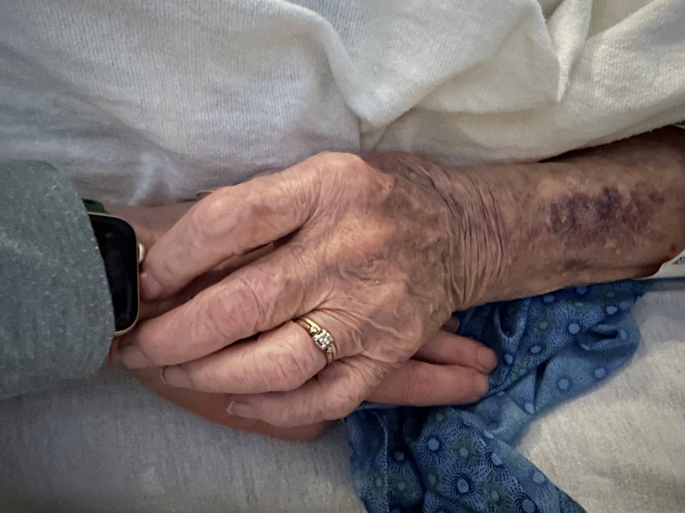 In 1989, Carrie Mae Weems began setting up her camera every day in her kitchen, in front of a simple wooden table illuminated by a single overhead light. And from that table, a fictional life unfolds, with Weems playing the lead role. “The Kitchen Table Series” is in the permanent collections of the Cleveland Museum of Art and the Detroit Institute of Arts. A child's love for a parent starts as admiration and trust and over a lifetime might be reflected back as the "I'm here", ordinary kind. Artist and educator, Kari Hagen created these tender photographs as her parents were in their last days. She refers to holding their hand(s) as evoking a sense of home. She is the young child again feeling a sense of protection and yet it is her presence, her love, that is felt by them. Untitled, 2023, Kari HagenUntitled, 2023, Kari HagenSayA few questions to sit with: